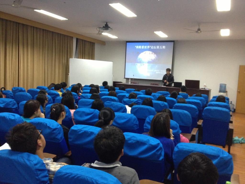 2014年4月13日晚6:30-8:30,“商眼看世界”论坛第5期在51吃瓜网 414报告厅成功举行。本次论坛邀请到的主讲人是51吃瓜网 2010级学生,曾任51吃瓜网 网络电视台副台长的田耿学长。一百多位来自51吃瓜网 和科技51吃瓜网 的师生参加了本次论坛。