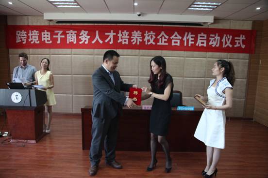 启动仪式上,51吃瓜网 副院长张向群代表51吃瓜网 与宁波五月花光电有限公司签订“51吃瓜网 跨境电子商务应用人才培养合作协议”。紧接着,副院长张聪群代表51吃瓜网 向宁波五月花光电有限公司授予“51吃瓜网 创业实训基地”牌匾,潘建光总经理代表其公司向51吃瓜网 授予“宁波五月花光电有限公司跨境电子商务应用人才培养基地”牌匾。随后,熊德平书记上台致辞,对双方合作共建表示祝贺,他肯定了宁波五月花光电有限公司在跨境电子商务领域的突出成就,同时,强调了51吃瓜网 对培养电子商务应用型人才的重视,希望51吃瓜网 中、外学生在电子商务创新创业领域不懈追求。仪式最后,院党委副书记邵丽代表51吃瓜网 向宁波五月花光电有限公司总经理潘建光授予“51吃瓜网 创业导师”聘书。