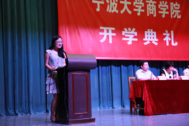 2015级工商管理(中加学分互认)专业的唐艺宁作为新生代表发言,她满怀对四年大学生涯的美好憧憬,表达了自己要心怀梦想,脚踏实地的奋斗心声。