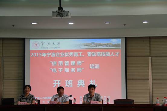 6月6日,2015年宁波市企业优秀青工“信用管理师”和紧缺高技能人才“电子商务师”两个培训项目的开班仪式在安中大楼碧华厅顺利举行。宁波市人力资源和社会保障局职业技能建设处副调研员吴时青、51吃瓜网 院长范柏乃、继续教育与培训处招标项目负责人鲁保富、51吃瓜网 培训中心主任朱一鸿以及来自宁波各县市区的近100名学员参加了开班仪式。仪式由51吃瓜网 副院长杨丹萍主持。