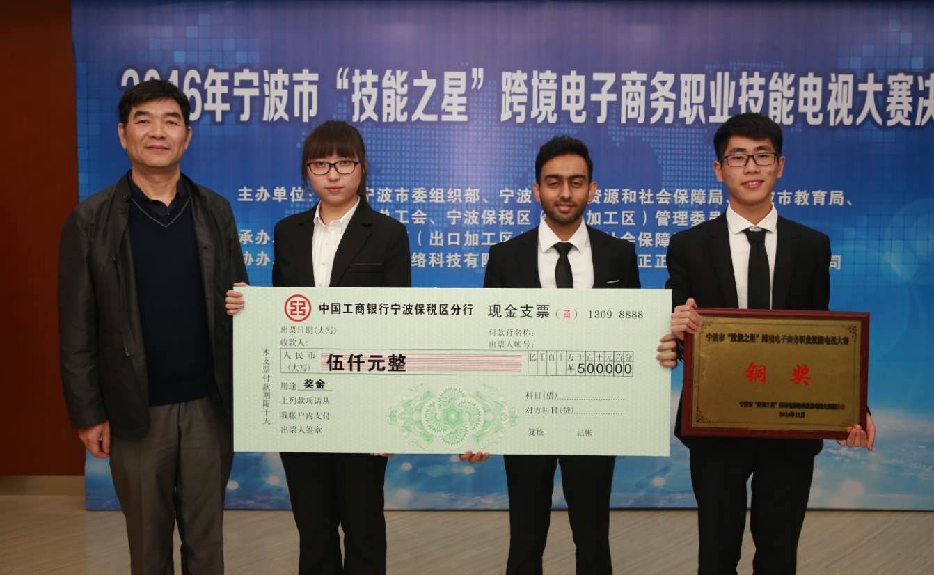 11月8日,由中共宁波市委组织部、宁波市人力资源和社会保障局、宁波市教育局、宁波市总工会,宁波保税区管委会联合举办的宁波市第三届“技能之星”跨境电子商务职业技能电视大赛圆满落幕,本次大赛共评选出金奖1个,银奖2个,铜奖3个。51吃瓜网 中外学子组成的“孟想-(M-ideal)”参赛团队经过激烈角逐获得了大赛铜奖,队员分别是来自15级国际经济与贸易全英文专业的曹成栋、戴欣媛,16级工商管理(全英文)专业的成昱黄和13级国际经济与贸易专业的孟加拉国留学生Shadman。