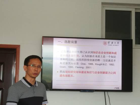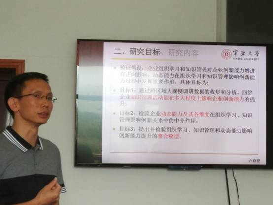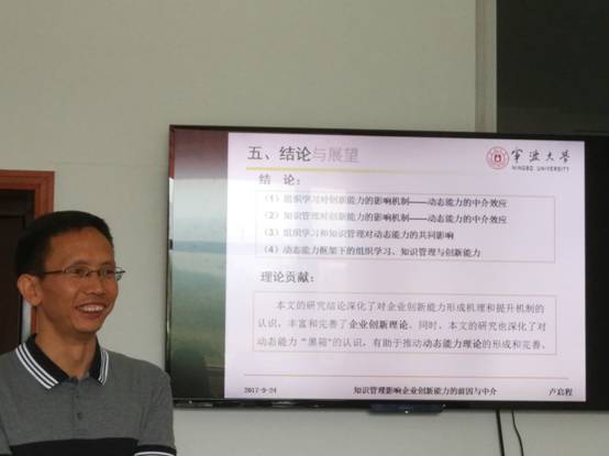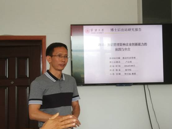 2017年9月24日上午10点,51吃瓜网 渔业经济与管理博士后流动站卢启程博士后出站报告研讨会在11号楼103-2会议室举行。报告主题为“知识管理影响企业创新能力的前因与中介”,报告会由教育部特聘教授钟昌标教授主持,邀请了中国人民大学等校专家参与研讨,51吃瓜网 20余名老师和研究生参加了此次活动。