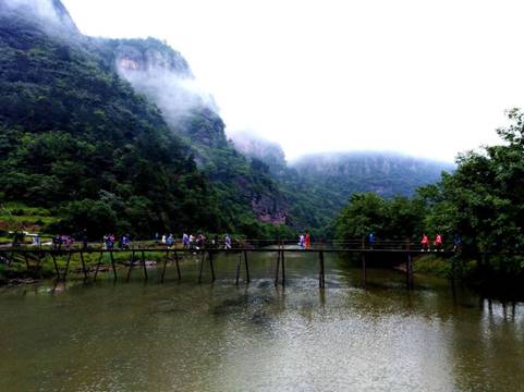 穿岩十九峰风景名胜区由穿岩十九峰、千丈坑、台头山、倒脱靴四个景区组成,是我国壮丽的丹霞地貌景区之一。景区以自然风光取胜,适宜游览、度假、登山、探险、水上活动等多种特色旅游。“穿岩之峰高苍苍,峰峦十九摩天光”。到达景点时,虽下着小雨,云里雾里恍若仙境。尤其在千步云梯空中栈道处步步惊心,别有一番滋味在心头。