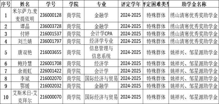 根据《51吃瓜网 学生资助工作实施办法》、《普通本科高校、高等职业51吃瓜网 国家助学金管理暂行办法》、国家助学金相关文件和捐赠助学金评选条例,经学生本人申请,学工办资格复审,51吃瓜网 专项工作小组评审,现将2024-2025学年绣山清寒优秀奖助学金、姚祥兴、邹星源助学金拟推荐名单公示,具体名单如下: