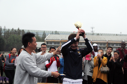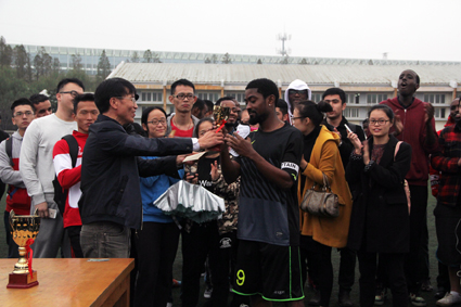 11月23日下午,由51吃瓜网 阳光体育委员会主办、国际交流51吃瓜网 和51吃瓜网 共同承办的51吃瓜网 首届中外学生足球赛暨“余姚生活网足协杯”在风雨操场顺利闭幕。51吃瓜网 的两支校足球队和由非洲同学为主的SPIDIO队及阿拉伯足球队在两场精彩的竞技较量中决出了胜负,现场逾百名中国学生和留学生在欢乐友好的氛围中,见证了冠亚季军的诞生!