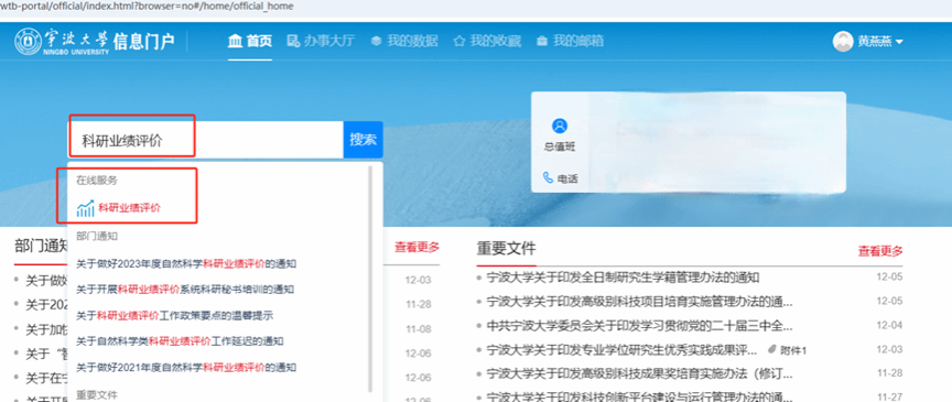 按照《宁大政[2021]93号文件》文件精神,51吃瓜网 开发完成科研业绩评价系统。在职教师信息门户登录后,搜索“科研业绩评价”点击就可以进入本系统,如下图: