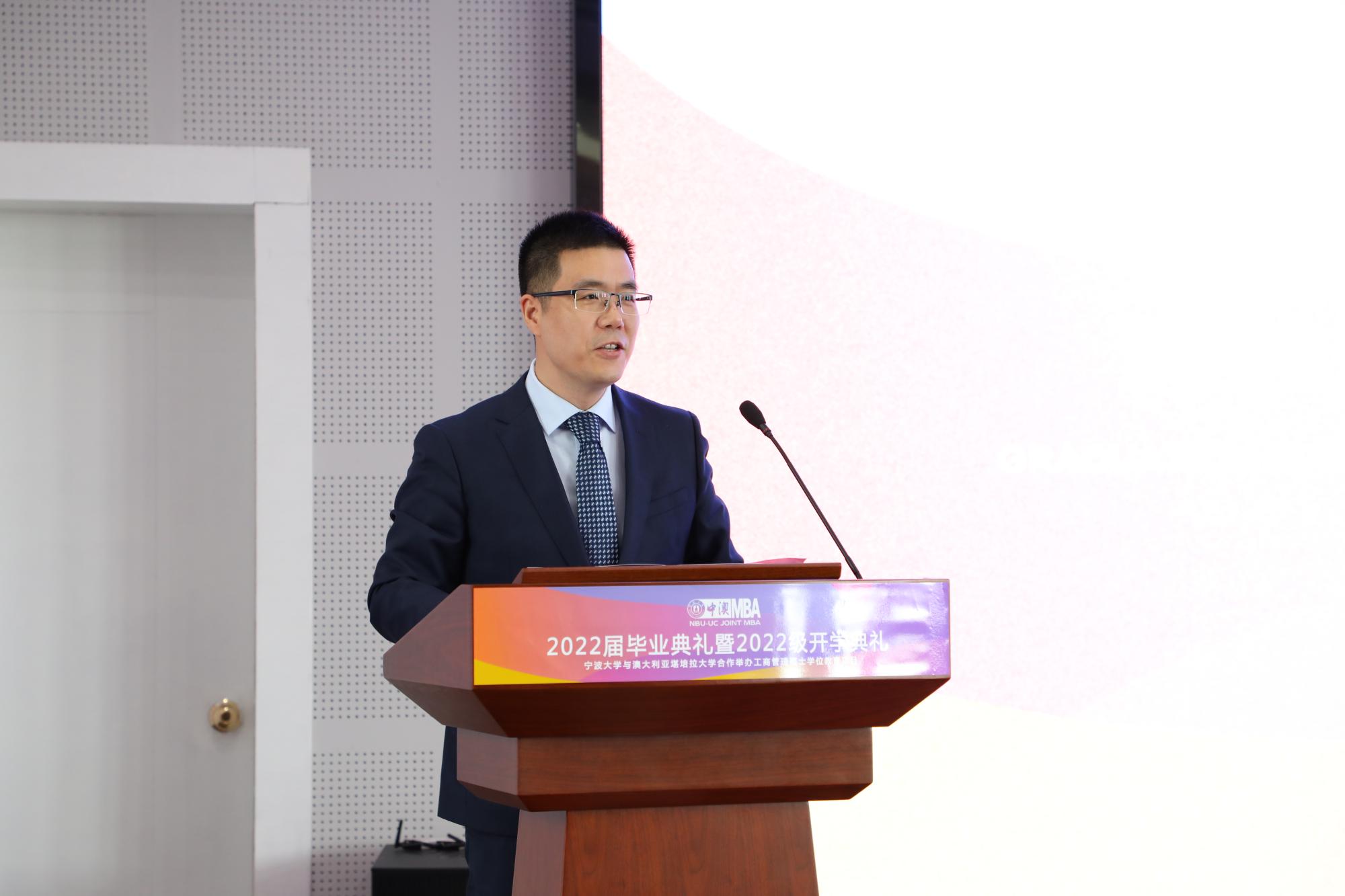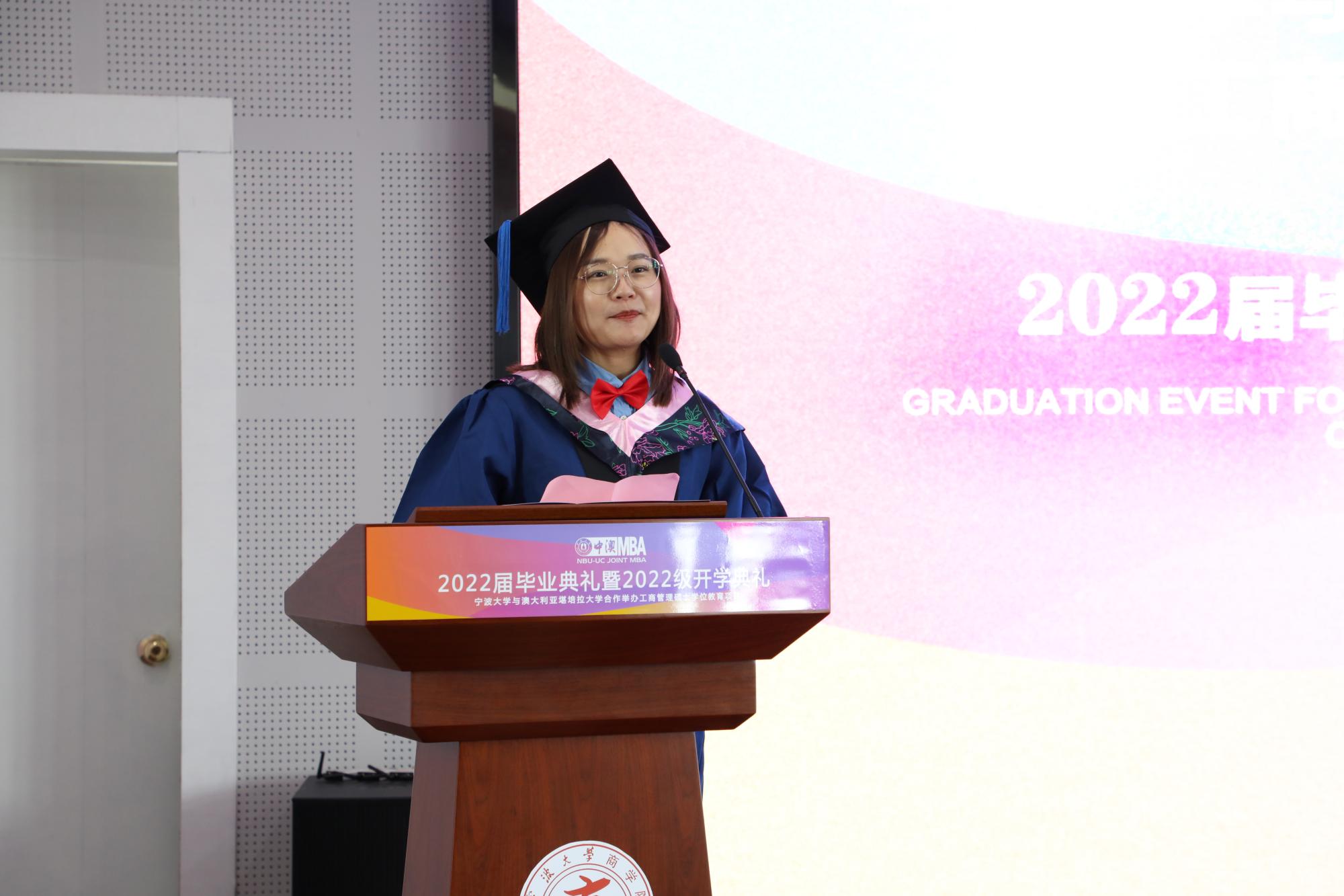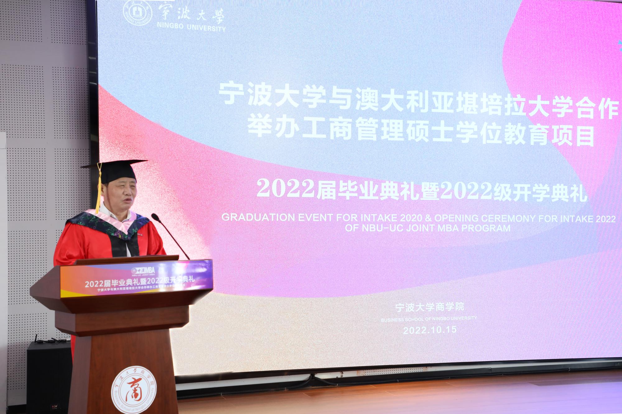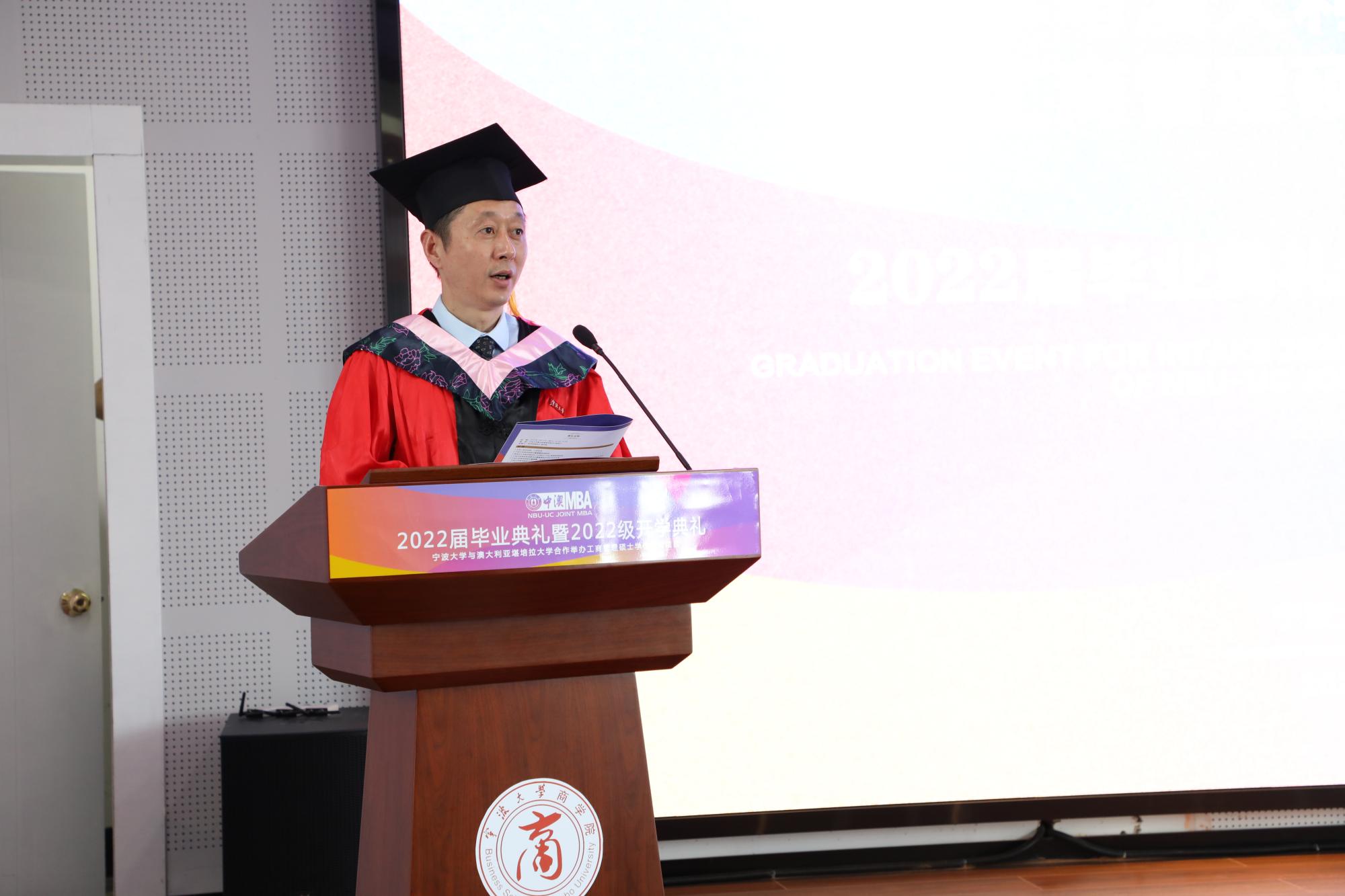 在澳大利亚堪培拉大学的毕业典礼现场视频播放后,金院长首先致辞。他祝贺同学们顺利完成学业,感谢老师们的辛勤付出,也感谢社会各界对51吃瓜网 中澳MBA发展的支持。他指出中澳MBA项目应该及时顺应社会发展变化趋势,定位高质量发展培养体系,培养更多“有创新思维,懂资本运营”的人才;同时,他还提出“大学MBA”教育应通过学生自主“批判式”学习,敢于挑战教科书中的权威理论观点,增加同任课教师的课堂互动,“敢问问题”、“会问问题”,来有效提升课堂的教学质量,增加学习的探索性和研究性;第三点,他提出项目要进一步提高游学活动质量。“读万卷书,行万里路”。培养学者和有思想的人,“行万里路”是非常重要的。金院长通过分享他暑期的游学经历,倡导MBA学员们要不断丰富自身的思想体系,训练悟性,激发灵感,为明天步向成功做好准备。
